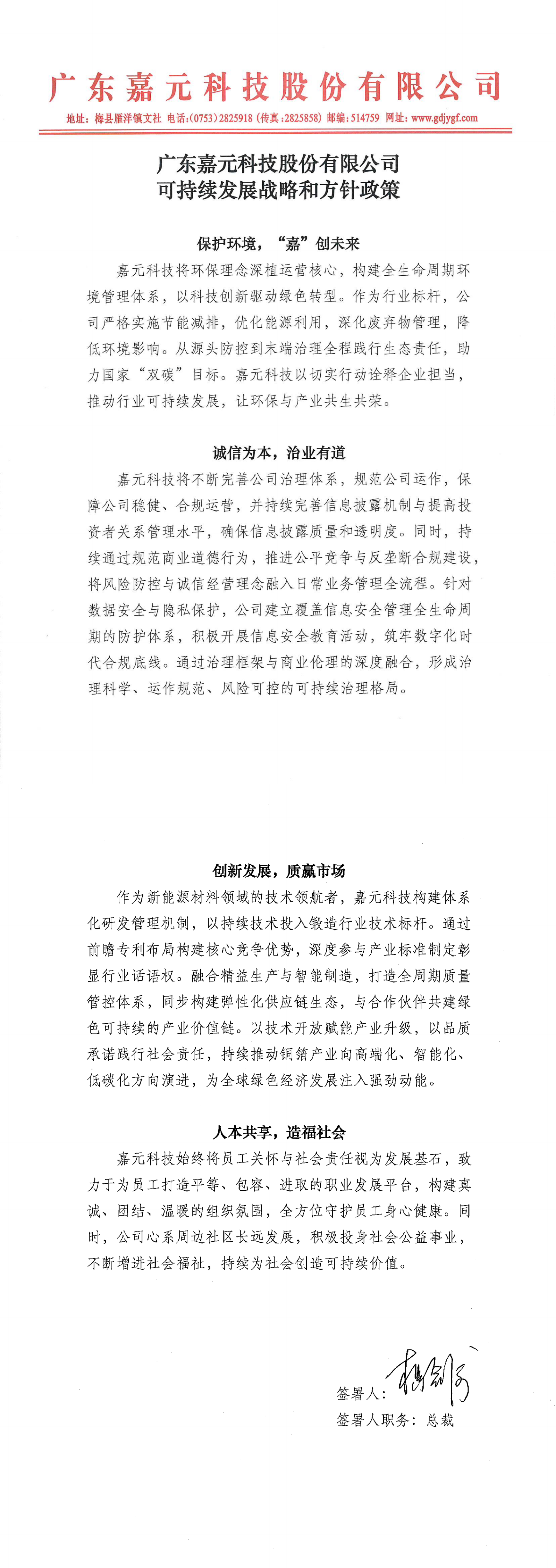 广东嘉元科技股份有限公司可持续发展战略和方针政策